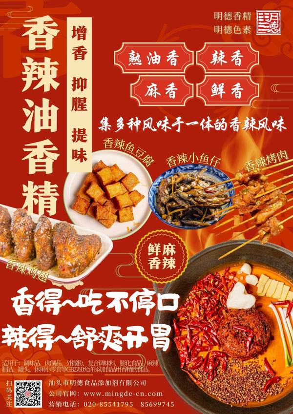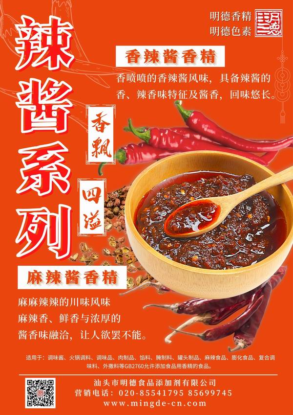 明德 麻辣醬香精、香辣醬香精 香飄四溢。麻麻辣辣的川味麻辣香、鮮香與濃厚的醬香相融合。香噴噴的香辣醬風(fēng)味,具備辣醬的醬香和辣香味交融,回味悠長(zhǎng),令人垂涎欲滴。
