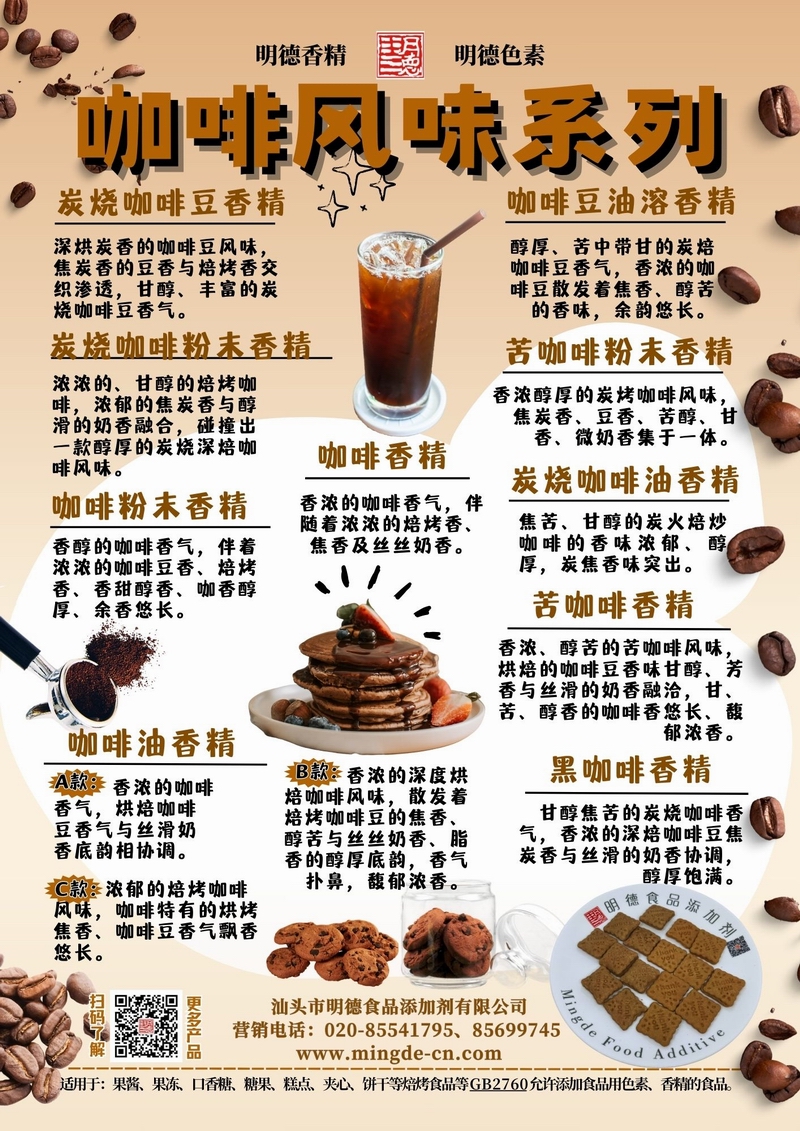 明德咖啡風味系列香精 | 多層咖啡醇香 覆蓋豐富應用場景汕頭市明德食品添加劑有限公司推出的咖啡風味系列香精,涵蓋多種焙炒、奶香、焦糖及深度烘焙調性,滿足飲品、烘焙、糖果、乳制品等多領域的咖啡風味需求,為B端客戶提供穩定、真實的咖啡香氣解決方案。