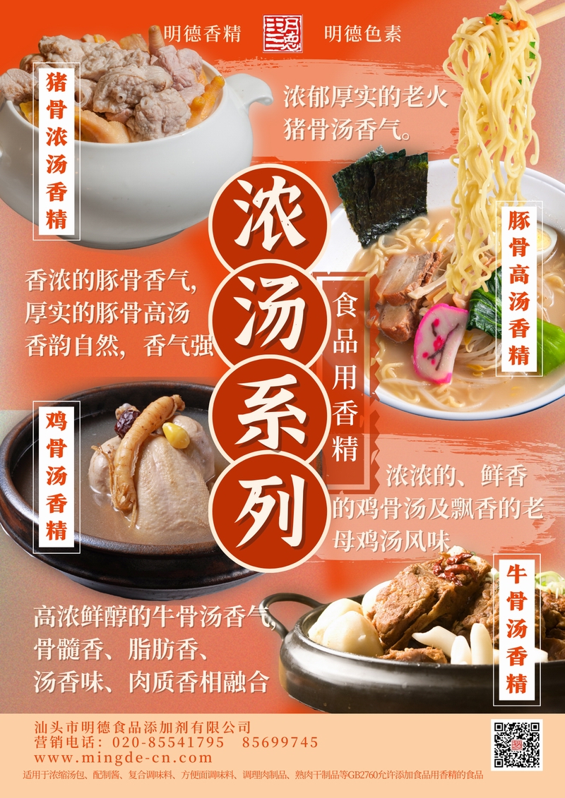 明德濃湯風味系列香精 骨湯真韻 湯感醇厚汕頭市明德食品添加劑有限公司推出的濃湯系列香精,涵蓋豬骨濃湯、豚骨高湯、雞骨湯、牛骨湯等多種調性。產品真實還原老火熬煮的骨香與湯感層次,香氣厚實,留香穩定。適用于調味料、復合調味料、濃縮湯包、方便面湯包、調理食品及肉制品等B端應用,幫助工廠快速打造統一、標準化的骨湯風味。