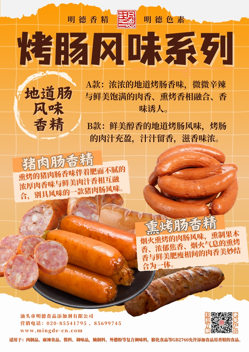 明德烤腸風味系列香精 煙熏肉香 層次真實汕頭市明德食品添加劑有限公司推出的烤腸風味系列香精,覆蓋地道腸風味香精、豬肉腸香精、熏烤腸香精等多種調(diào)性。產(chǎn)品風味真實、留香穩(wěn)定,適用于肉制品、復合調(diào)味、腌制與外撒粉等B端工廠,幫助快速打造具有記憶點的烤腸類風味。
